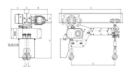 2、電動葫蘆防護(hù)等級為IP54,馬達(dá)具絕緣等級F與過熱保護(hù)系統(tǒng)。
