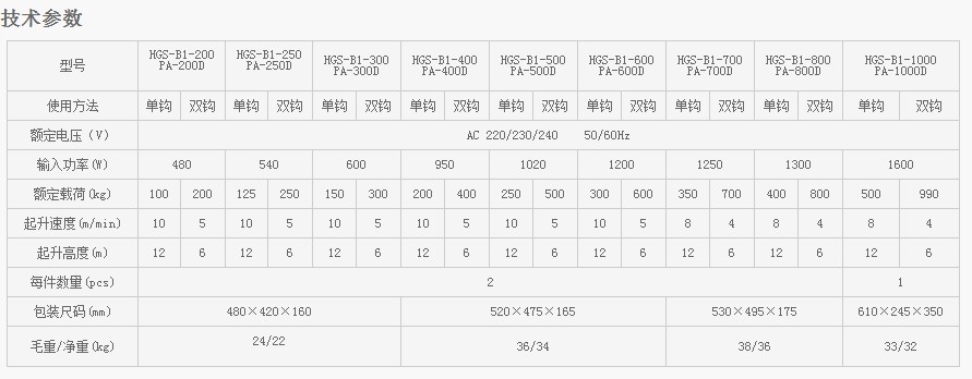 浙江凱勛PA200D-PA1000D微型電動葫蘆技術(shù)參數(shù):