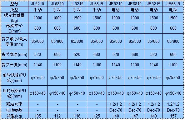 無錫虎力JL型剪式升高液壓搬運(yùn)車(雙節(jié)油缸)技術(shù)參數(shù):